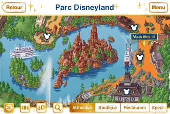 Grâce au système de géolocalisation de l'application Disneyland Paris, vous pouvez vous situer précisément dans le parc. En bonus : une vue en 3D (non testé car seulement disponible dans le parc) des attractions.