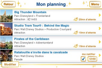 L'application Disneyland Paris propose enfin un planning pour préparer votre visite tout au long de la journée afin de ne rien manquer du spectacle. Vous pouvez y ajouter des évènements depuis les fiches descriptives des attractions, restaurants, spectacles...